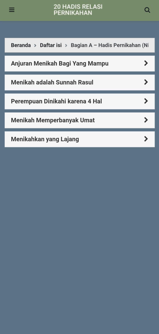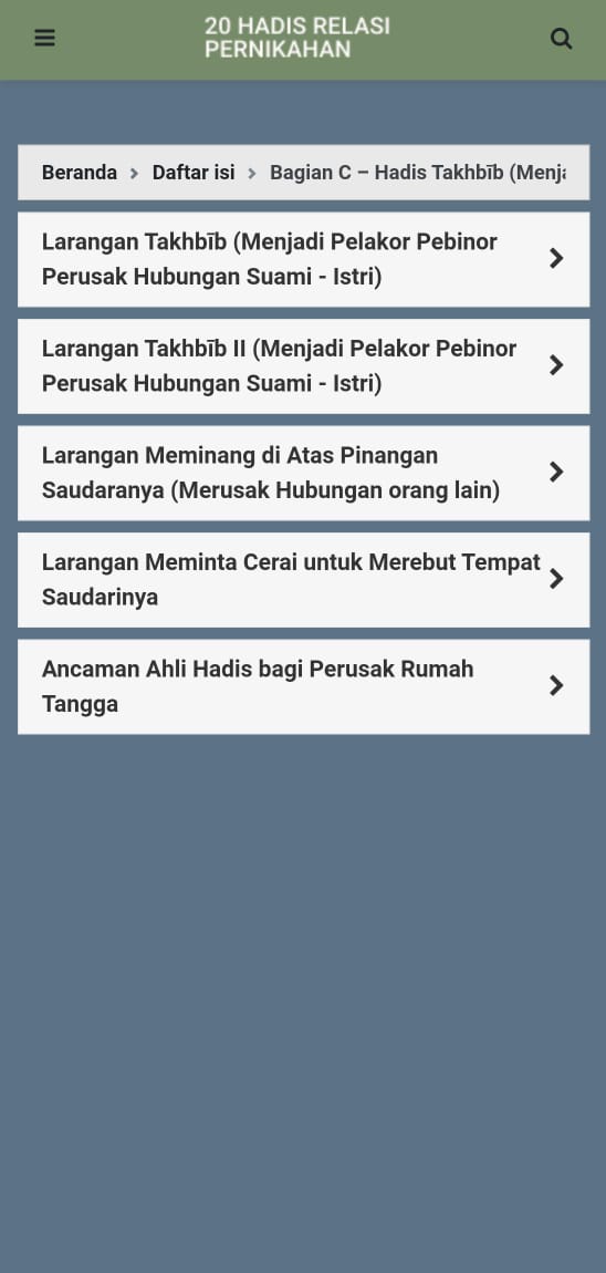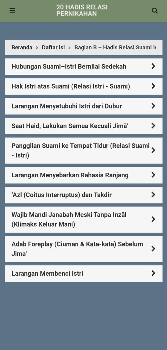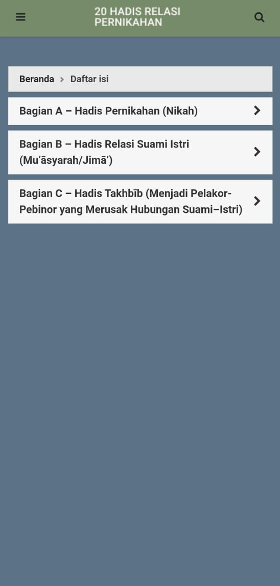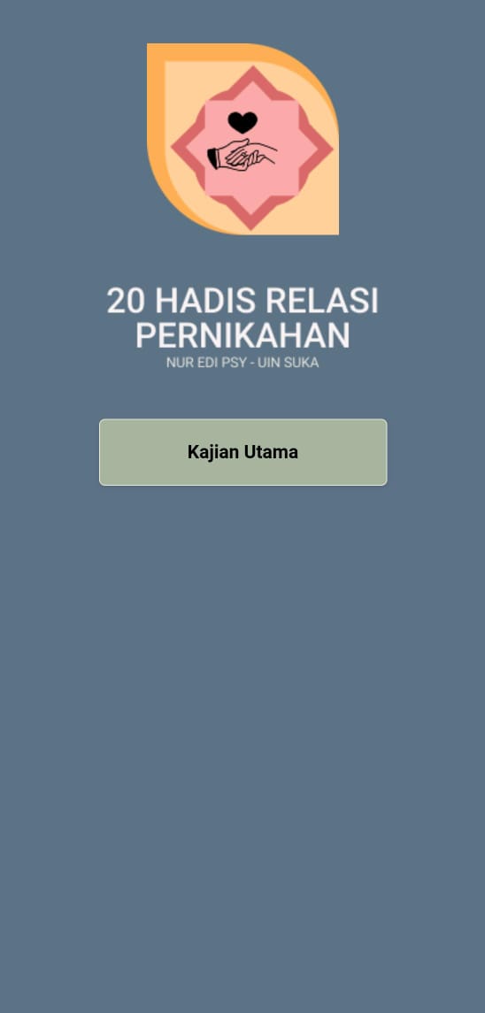 Berdasarkan hal tersebut, lahirlah sebuah aplikasi berisi kumpulan hadis yang dirancang untuk memberikan edukasi kepada para pemuda maupun pasangan suami istri. Aplikasi ini diharapkan mampu menjadi pendamping dalam membina rumah tangga yang harmonis, sesuai tuntunan agama serta tetap sejalan dengan nilai-nilai adat. Bahkan, kumpulan hadis yang disajikan dapat pula dijadikan sebagai “bahan pendamping pra-nikah”, sehingga calon pasangan lebih siap membangun keluarga yang baik dan benar.