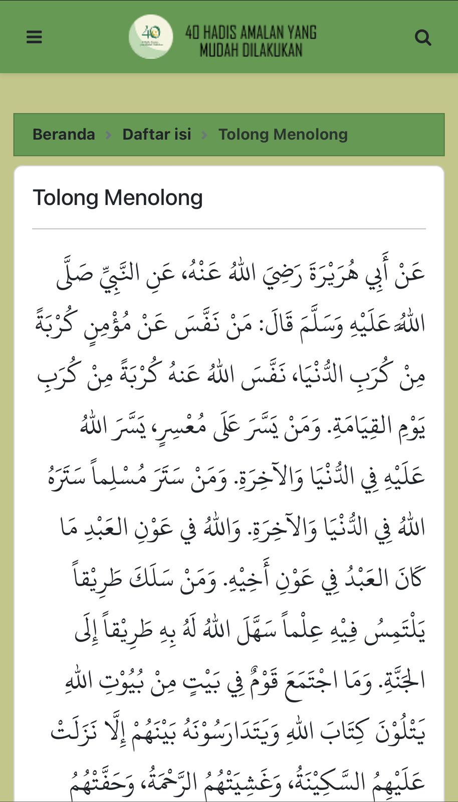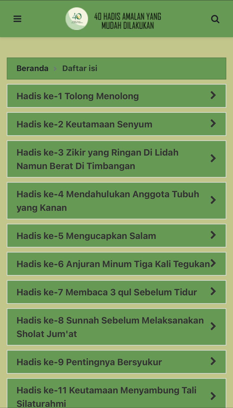 40 Hadis Amalan yang Mudah Dilakukan adalah teman setia Anda untuk memperkaya spiritualitas dan mengamalkan sunah dalam hidup modern. Aplikasi ini dirancang khusus untuk kaum Muslimin yang ingin memahami dan mengaplikasikan ajaran Nabi Muhammad SAW tanpa merasa terbebani. Kami telah memilih 40 hadis yang berfokus pada amalan-amalan sederhana namun penuh berkah yang bisa Anda lakukan setiap hari. Setiap hadis dilengkapi dengan: