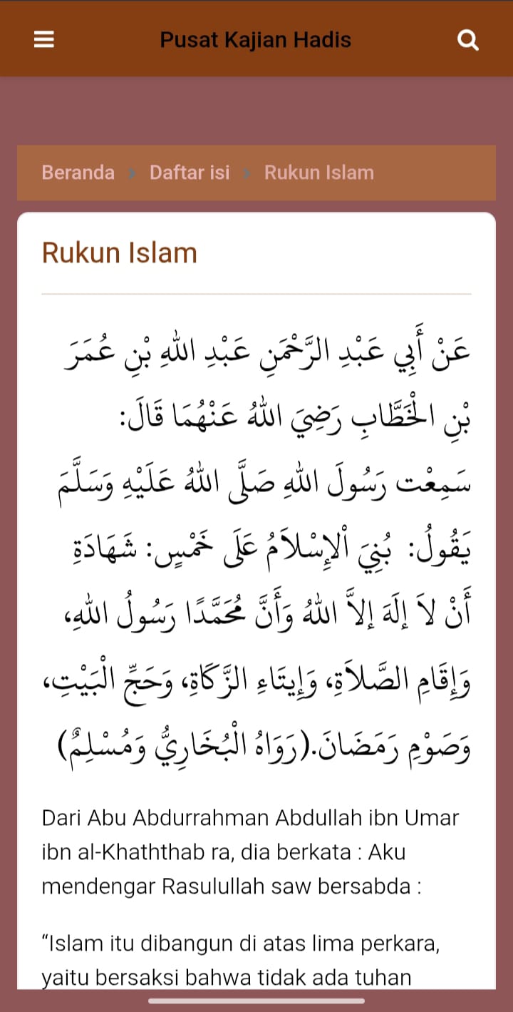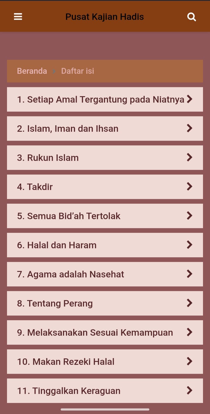 Di bagian bawah layar ada tombol besar berwarna cokelat bertuliskan “KAJIAN UTAMA”. Ini sepertinya menjadi tombol utama untuk memulai membaca hadis.